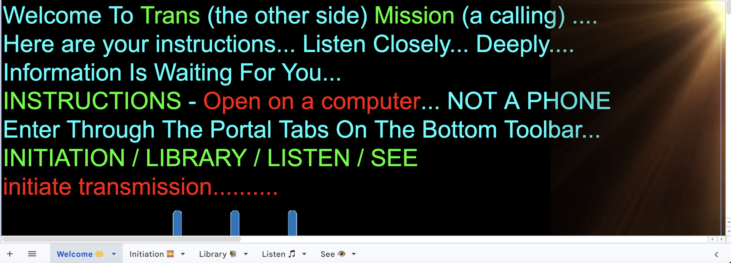 receiving messages from the ancestors, about what is being passed down, spirit radio TRANSMISSION… TRANS (the other side) MISSION (a calling). Transcorporeality, environments and the unification between human beings and place. Nature. Nature as a being, what are the messages. A cave, the depth, the crystallization, discovery. In the book THE TIBETAN BOOK OF THE DEAD, there's a line in the preface to the third edition that reads, "The field of normal man's perceptions is, as can be demonstrated, narrowly circumscribed and extremely limited. There are objects and colours he cannot see, sounds he cannot hear, odours he cannot smell, tastes he cannot taste, and feelings he cannot feel." How do we share what is Intangible, ephemeral? Is there a connection between stardust and the druzy of a crystal, (a universe within a universe), repurposed, changing form, was I a crystal in a past life, what are the ancestors saying? We are multi-sensory beings in multiplicity, going beyond the five senses. Going beyond human experience. Improvisation >>>> practice, not product, beyond the tangible. I repeat - Value centered in exploration, discovery, expression, it’s deeply personal, inherently non-linear. It acknowledges failure, imperfection and growth as essential nutrients for realization, connection and truth-telling. Intangible >>>> anti-capitalism, the spiritual, the communal, the existential. A very precious thing we share.